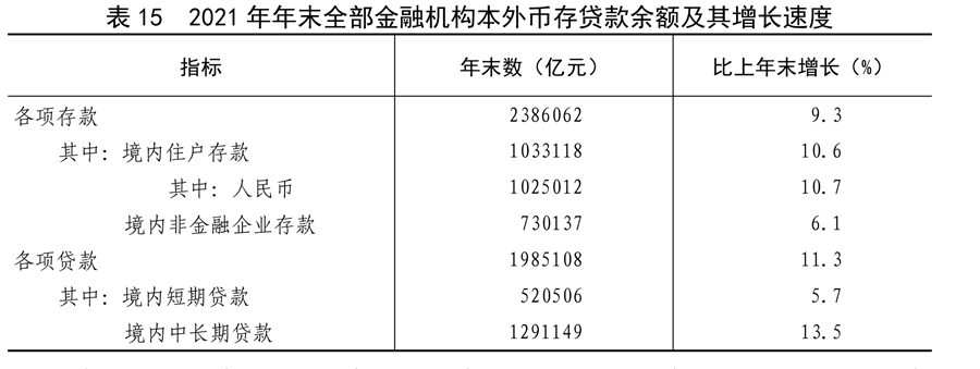 全年社会融资规模增量[45]31.4万亿元,按可比口径计算,比上年少3.4万亿元。年末社会融资规模存量[46]314.1万亿元,按可比口径计算,比上年末增长10.3%,其中对实体经济发放的人民币贷款余额191.5万亿元,增长11.6%。年末全部金融机构本外币各项存款余额238.6万亿元,比年初增加20.2万亿元,其中人民币各项存款余额232.3万亿元,增加19.7万亿元。全部金融机构本外币各项贷款余额198.5万亿元,增加20.1万亿元,其中人民币各项贷款余额192.7万亿元,增加19.9万亿元。人民币普惠金融贷款[47]余额26.5万亿元,增加5.0万亿元。