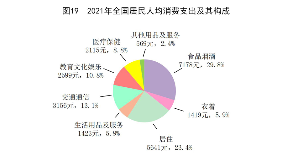 全年全国居民人均消费支出24100元,比上年增长13.6%,扣除价格因素,实际增长12.6%。其中,人均服务性消费支出[56]10645元,比上年增长17.8%,占居民人均消费支出的比重为44.2%。按常住地分,城镇居民人均消费支出30307元,增长12.2%,扣除价格因素,实际增长11.1%;农村居民人均消费支出15916元,增长16.1%,扣除价格因素,实际增长15.3%。全国居民恩格尔系数为29.8%,其中城镇为28.6%,农村为32.7%。