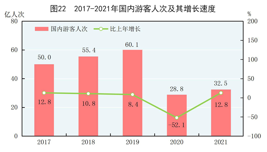 全年国内游客32.5亿人次,比上年增长12.8%。其中,城镇居民游客23.4亿人次,增长13.4%;农村居民游客9.0亿人次,增长11.1%。国内旅游收入29191亿元,增长31.0%。其中,城镇居民游客花费23644亿元,增长31.6%;农村居民游客花费5547亿元,增长28.4%。