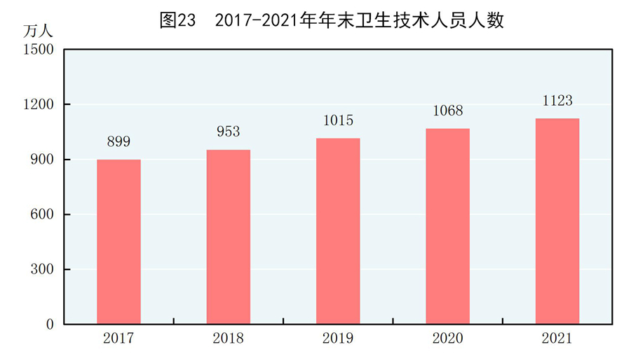年末全国共有医疗卫生机构103.1万个,其中医院3.7万个,在医院中有公立医院1.2万个,民营医院2.5万个;基层医疗卫生机构97.7万个,其中乡镇卫生院3.5万个,社区卫生服务中心(站)3.6万个,门诊部(所)30.7万个,村卫生室59.9万个;专业公共卫生机构1.3万个,其中疾病预防控制中心3380个,卫生监督所(中心)2790个。年末卫生技术人员1123万人,其中执业医师和执业助理医师427万人,注册护士502万人。医疗卫生机构床位957万张,其中医院748万张,乡镇卫生院144万张。全年总诊疗人次[70]85.3亿人次,出院人数[71]2.4亿人。截至年末,全国累计报告新型冠状病毒肺炎确诊病例102314例,累计治愈出院病例94792例,累计死亡4636人。全国累计报告接种新型冠状病毒疫苗283533万剂次。全国共有11937家医疗卫生机构提供新型冠状病毒核酸检测服务,总检测能力达到4168万份/天。