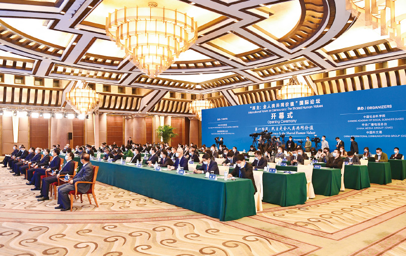 2021年12月4日,“民主:全人类共同价值”国际论坛在北京开幕。论坛由中共中央宣传部、国务院新闻办公室主办,于12月4日至5日、9日至10日、14日至15日分三个阶段举行,来自120多个国家和地区、20多个国际组织的500余名嘉宾线上线下参会,共同探讨民主真谛。图为论坛现场。 中新社发 田雨昊/摄
