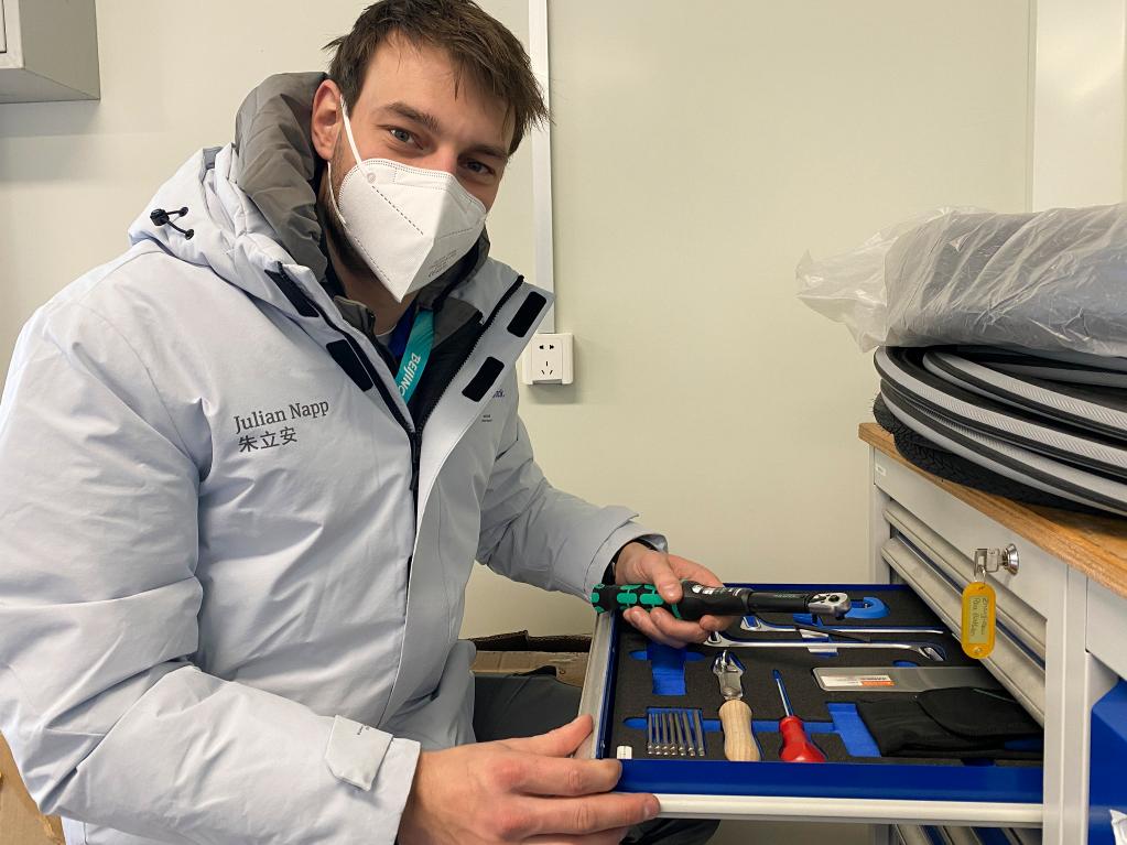 在云顶滑雪公园,矫形器、假肢与轮椅维修中心的维修技术人员朱利安·纳普展示工作中需要使用的各类工具。新华社记者许畅摄