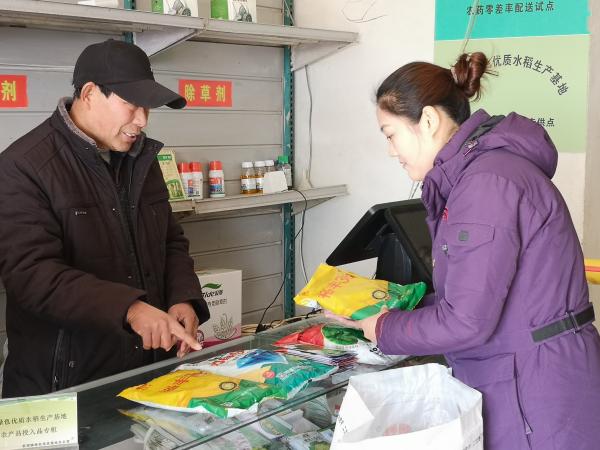 权太琦(右)在农资销售店询问价格变化。 新华社记者 陆华东 摄