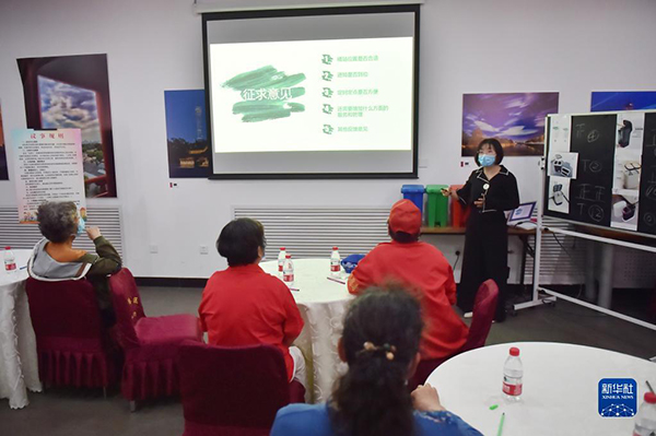 在北京建国门街道赵家楼社区议事厅举行的“两桶一袋”居民征求意见恳谈会上,来自社区的12位垃圾分类达人对“两桶”款式进行投票选择,同时,街道针对桶站位置、定时定点投放等垃圾分类运营管理听取居民意见(2020年5月2日摄)。新华社记者?彭子洋?摄