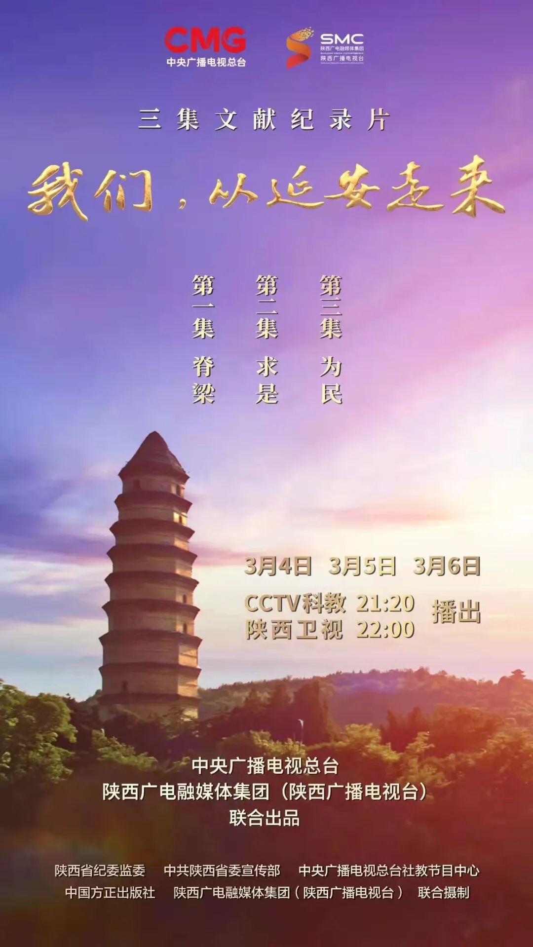 3月4日至3月6日每天21:20,由中央广播电视总台与陕西广电融媒体集团联合出品的三集文献纪录片《我们,从延安走来》(每集45分钟),将在中央广播电视总台央视科教频道播出。本片深入贯彻党的十九届六中全会精神,以新时代的视角回顾中国共产党在延安的革命历史,讲述新中国从延安走来的故事,阐释延安精神,是迎接党的二十大,解读中国共产党人精神谱系的重要影视作品。
