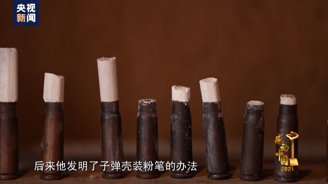朱彦夫用两支残臂夹着粉笔,总是写了断,断了写,后来他发明了子弹壳装粉笔的办法。
