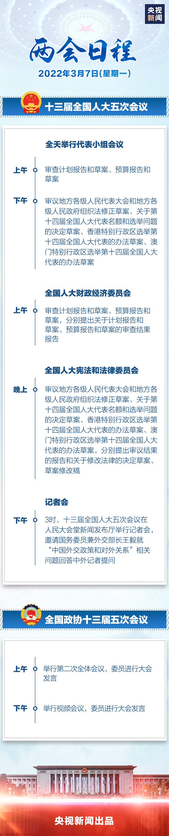 原标题:两会日程丨3月7日:人代会审查计划、预算报告 审议地方组织法修正草案 政协委员进行大会发言