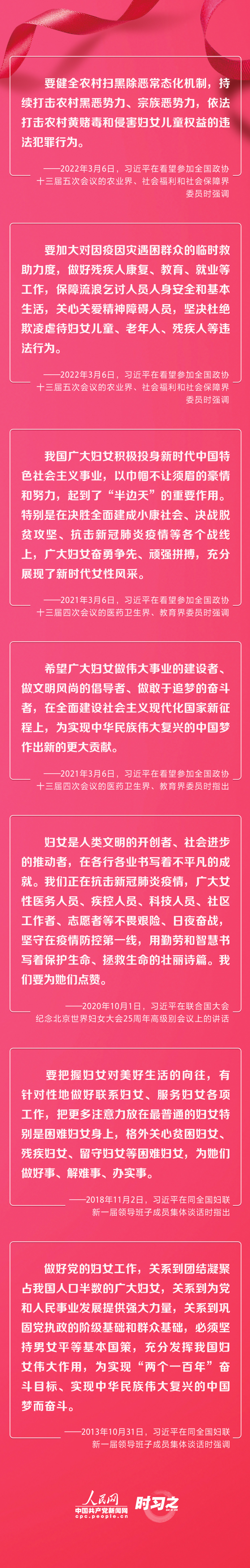 习近平曾在多个场合强调保障妇女权益,表达对广大妇女的亲切关怀和高度赞扬,殷殷关怀凝聚巾帼之力。