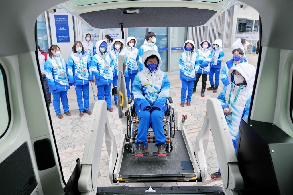 2月28日,张家口颁奖广场的志愿者演练操作无障碍设施。新华社记者牟宇摄