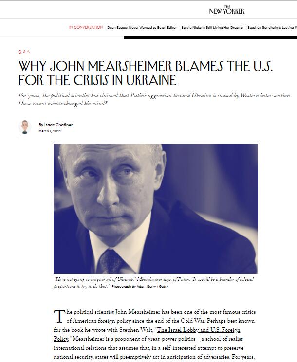 美国《纽约人》周刊网站3月1日发表题为《为什么约翰 米尔斯海默把乌克兰危机归咎于美国》的文章,作者是该刊特约撰稿人伊萨克 肖蒂纳。政治学家约翰 米尔斯海默(John Mearsheimer)是冷战结束以来美国外交政策最著名的批评家之一。