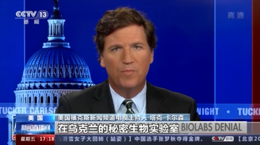 美国福克斯新闻频道电视主持人 塔克·卡尔森:昨天我们报道了,美国政府资助了在乌克兰的秘密生物实验室进行危险的病原体研究。我们以为这不是真的,这太夸张了,太奇怪了。美国政府也多次强烈否认,并称这是俄罗斯的宣传工具,我们愚蠢地认为美国政府说的是真的,但美国政府负责乌克兰问题的官员确认美国资助乌克兰生物实验室的说法是真的。