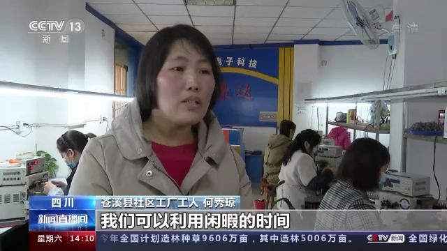 苍溪县社区工厂工人 何秀琼:娃娃上学走了,我们可以利用闲暇的时间,来厂里面做一点零工,工资也还是可以,一个月有2000多块钱。