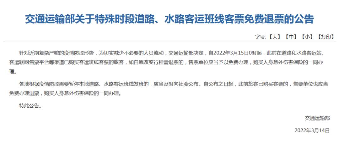 针对近期复杂严峻的疫情防控形势,为切实减少不必要的人员流动,交通运输部决定,自2022年3月15日0时起,此前在道路和水路客运站、客运联网售票平台等渠道已购买客运班线客票的旅客,如自愿改变行程需退票的,售票单位应当予以免费办理,购买人身意外伤害保险的一同办理。