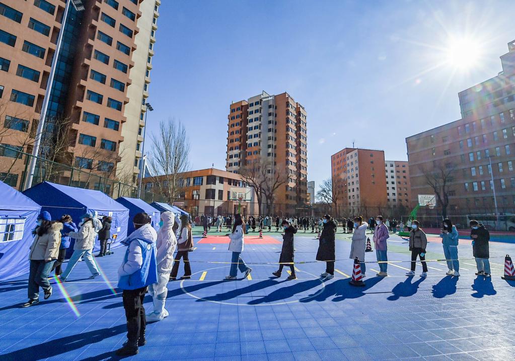 3月2日,内蒙古医科大学学生在校园内排队做核酸检测。新华社记者 彭源 摄