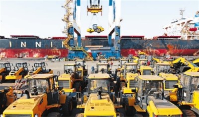 三月十日,山东烟台港,出口非洲的压路机正在装载。