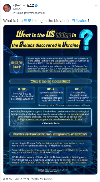 “美国在乌克兰生物实验室隐瞒了什么?” 赵立坚的推文这样写道。↓