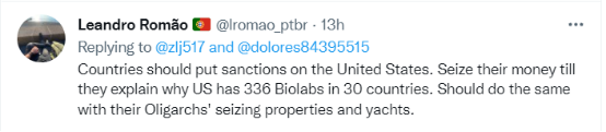 “各国应该对美国实施制裁,扣押他们的资金,直到他们解释为什么美国在 30 个国家有 336 个生物实验室。同样也应该扣押他们的寡头的财产和游艇。”