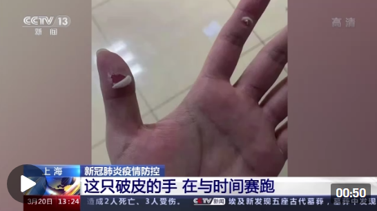 上海本轮疫情发生后,核酸检测采样、检测工作量激增,核酸采样和检测人员坚守岗位分秒不停。这两天在社交媒体上,一张医务人员破皮的手的照片让大家动容。