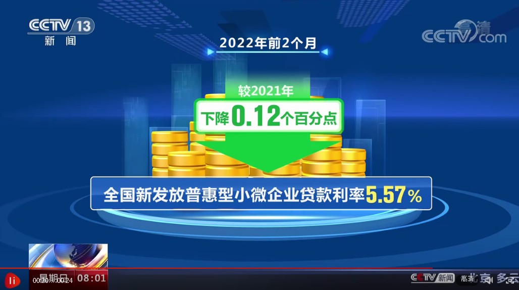 央视网消息:银保监会数据显示,截至2月末,全国普惠型小微企业贷款余额19.67万亿元,同比增速达到22.16%,较各项贷款增速高11.15个百分点。今年前两个月,全国新发放普惠型小微企业贷款利率5.57%,较2021年下降0.12个百分点。