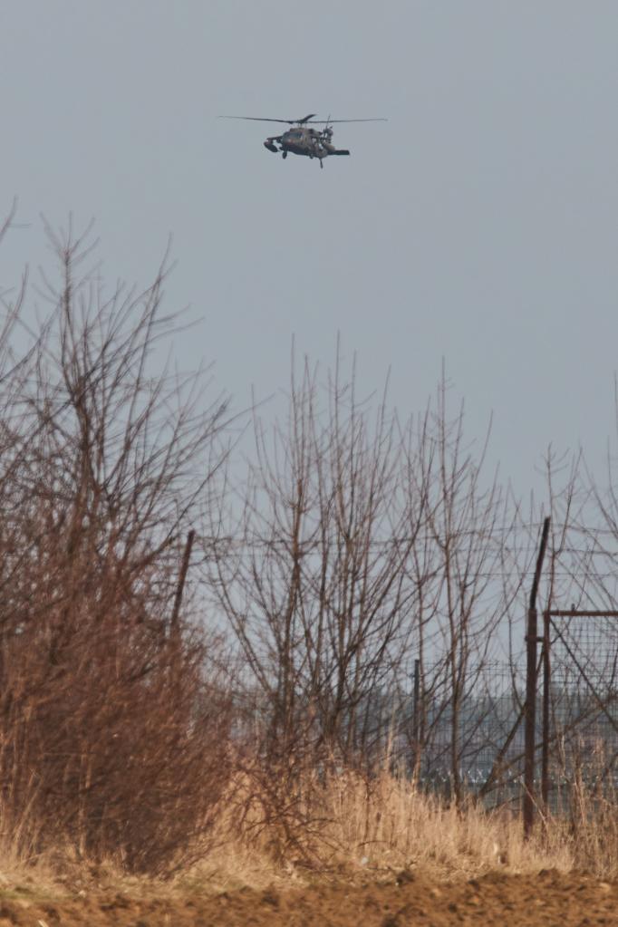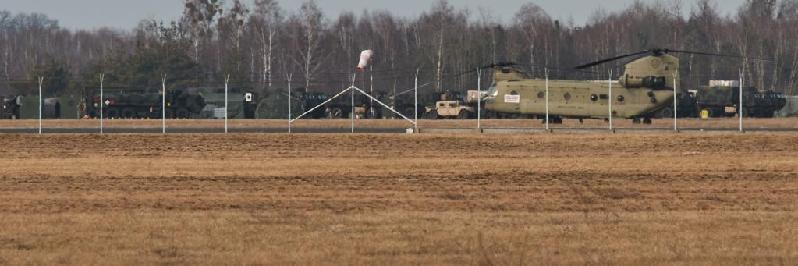 记者又驱车前往热舒夫西北部60多公里处的梅莱茨机场。驶近机场就看到黑鹰直升机低空盘旋。在这座面积并不大的机场外,排队停着十多辆油罐车,准备提供燃油供给。机场附近,两名荷枪实弹的美军士兵把守着一座美军军营。从外围可以看到机场里停靠着数架黑鹰直升机和奇努克运输直升机。