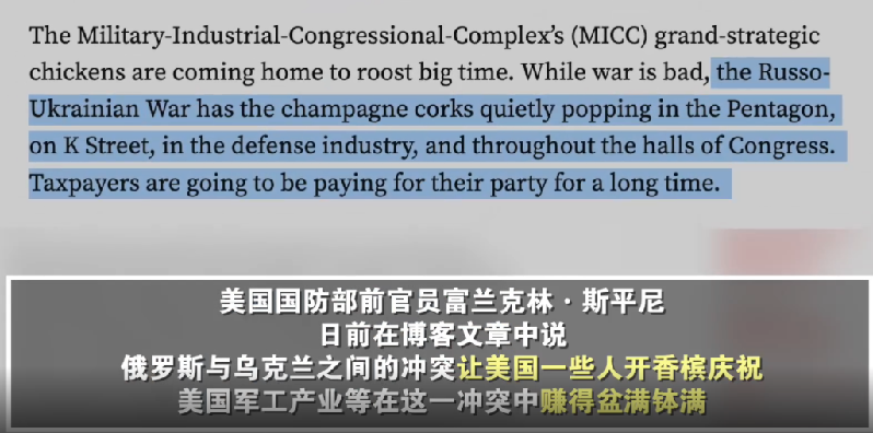 “俄乌冲突爆发以来,五角大楼(美国国防部)、K街(华盛顿游说公司聚集地)、军工企业以及整个国会大厦内,都在悄悄地开香槟庆祝。”曾在美国国防部长办公室工作26年的富兰克林·斯平尼如此点评。