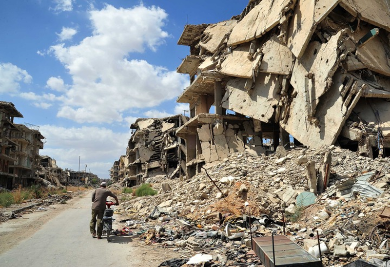 2021年9月23日,在叙利亚首都大马士革城南的巴勒斯坦难民聚居区——耶尔穆克难民营,行人从建筑废墟旁走过。耶尔穆克难民营自2015年4月被极端组织“伊斯兰国”占领,此后三年间成为叙利亚政府军与极端组织激烈交火的战场。如今战火虽已平息,但战争造成的巨大破坏仍随处可见。新华社发(阿马尔·萨法尔贾拉尼摄)