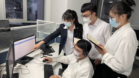 3月20日,夜色中,董红晨(站立左一)与同事们正在讨论工作。