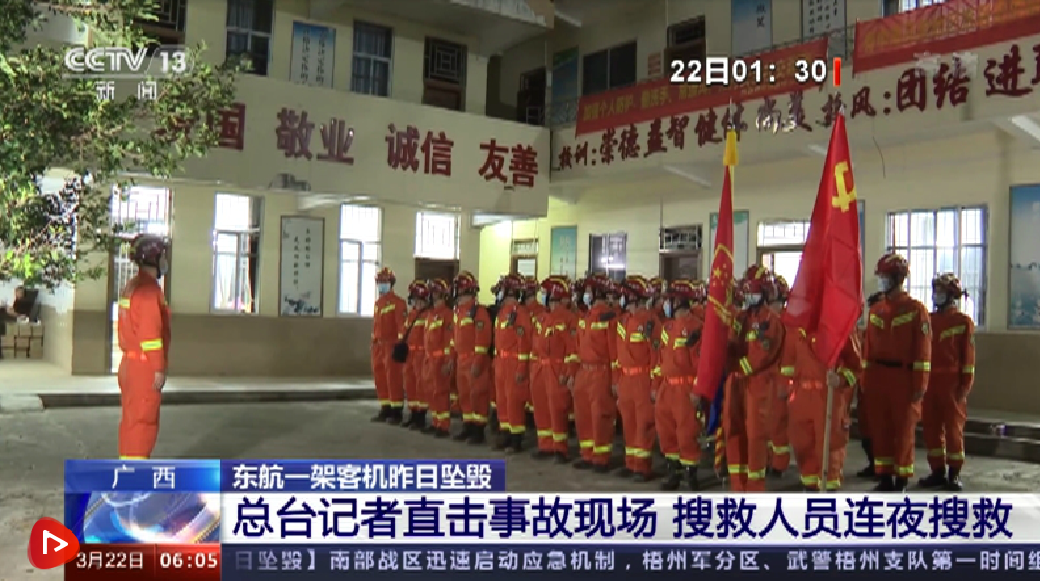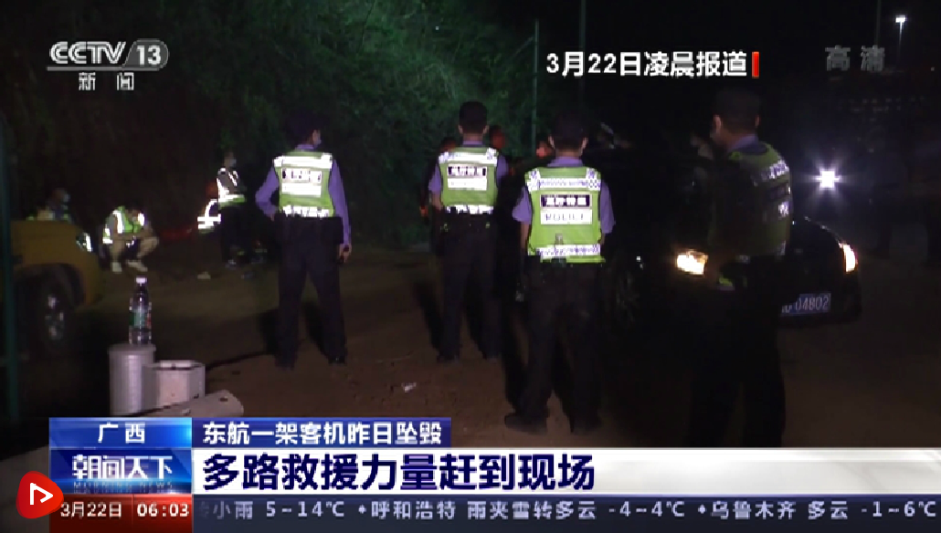 央视网消息:3月21日14时38分许,东方航空公司MU5735航班执行昆明—广州任务时,在广西梧州市上空失联并坠毁。机上载有乘客123人、机组人员9人。经确认,坠毁位置为广西梧州市埌南镇莫埌村神塘表附近山林,坠机引发的森林火灾当天被扑灭。东航客机坠毁后,国家民航局启动应急机制,并派出工作组于昨晚抵达梧州迅速开展工作,指导协助当地现场救援、善后处置等。