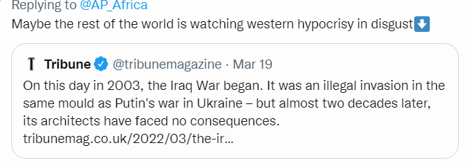 3月19日,美联社非洲区域办公室的社交媒体账户发布文章称:“在全世界齐声谴责俄罗斯对乌克兰发动战争之际,非洲国家大多保持沉默——这提醒人们,克里姆林宫对这个拥有13亿人口的大陆有着巨大的影响力。”