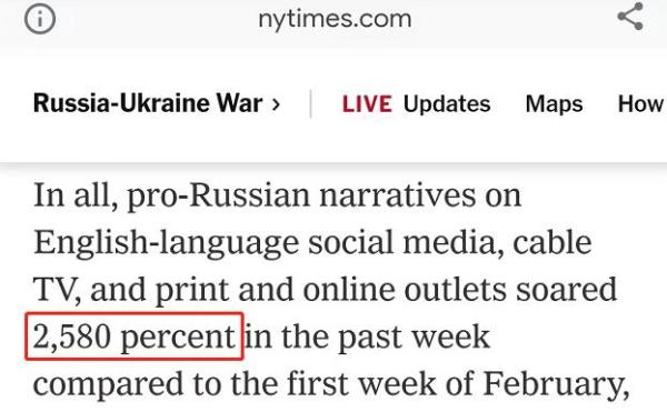 △《纽约时报》文章说,2月末,英文社交媒体上,挺俄言论相比2月初涨了25.8倍。