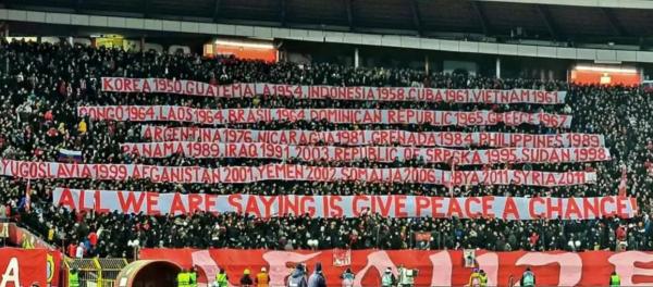 当地时间17日,欧联杯八分之一决赛次回合比赛中,主场的塞尔维亚球迷在看台上打出六条巨大横幅,按年份细数美国、北约组织参与入侵过的20多个国家。最大的一条横幅则写着“我们想说的是,给和平一个机会!”这是约翰·列侬著名歌曲《给和平一个机会》里的歌词。全场球迷高唱这首歌,讽刺西方口喊“反战”,行动上却一直在拱火。