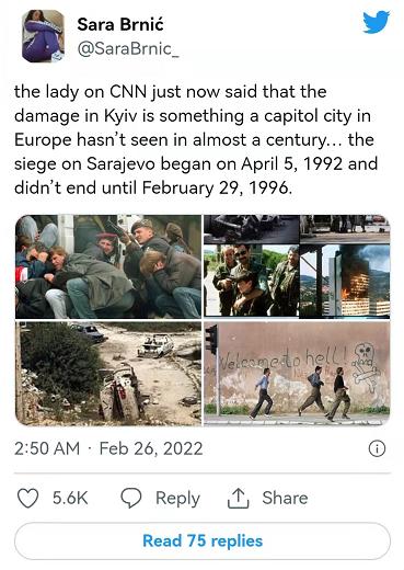 △塞尔维亚网友痛斥美媒无知:美国有线电视新闻网(cnn)说基辅受到的破坏是欧洲首都城市近百年所未见,但萨拉热窝在90年代可是被围困了四年之久。