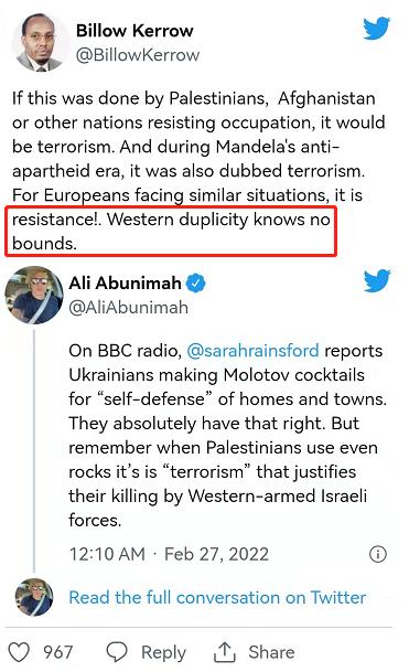 一位记者指出,英国广播公司(bbc)对乌克兰人制作燃烧瓶对付俄罗斯军人的行为大加赞扬,但当巴勒斯坦人因为向装备全副西式武装的士兵扔石子被杀时,西方却称巴勒斯坦人为“恐怖分子”。一位肯尼亚政治家说得更直接:“西方双标起来没有底线。”