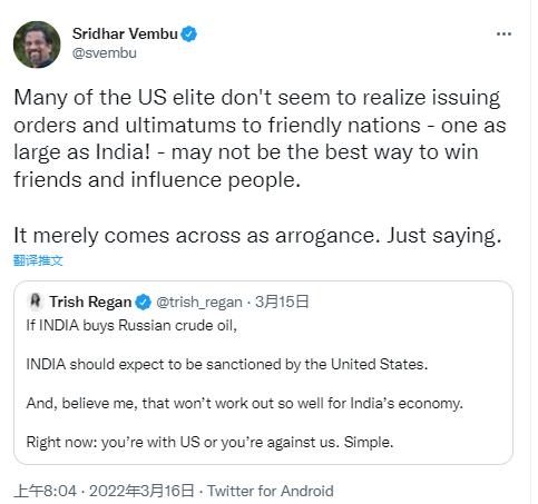 美国福克斯商业频道女主播翠西·里根15日也在社交媒体上发文称,“如果印度购买俄罗斯原油,应该受到美国制裁。这对印度经济来说不是好事。现在(印度面临的选择)是支持美国还是反对美国,这很简单。”印度富商、软件公司zoho创始人斯里达尔·芬布随后转发该帖文写道,“许多美国精英似乎没有意识到,对一个像印度这样大的友好国家发号施令和下达最后通牒,可能不是赢得朋友和影响他人的最佳方式。只能给人傲慢的印象。”