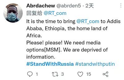 一位受不了西方媒体虚伪和双标说辞的埃塞网友呼吁俄罗斯媒体增强在非洲的存在,因为西方媒体“剥夺”了他们的信息获取。