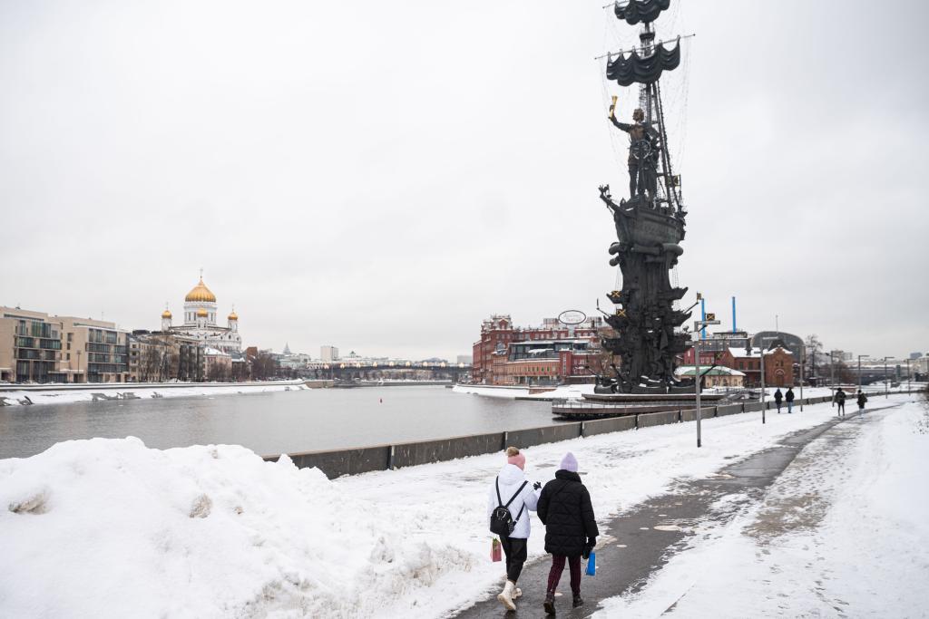 2月10日,人们走在俄罗斯首都莫斯科积雪的道路上。(新华社记者白雪骐摄)