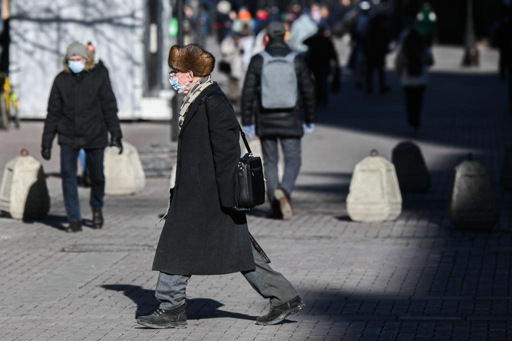 3月15日,人们佩戴口罩在俄罗斯首都莫斯科出行。(新华社发,叶甫盖尼·西尼岑摄)