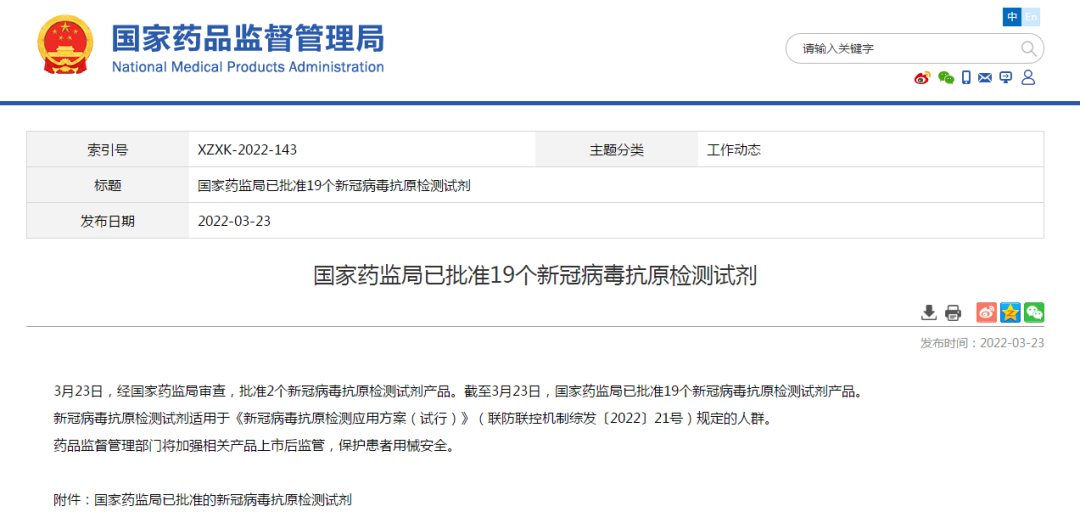 国家药监局已批准19个新冠病毒抗原检测试剂