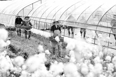 江西省宜春市上高县泗溪镇曾家村育秧基地,村民正在搬运秧盘。陈旗海摄/光明图片