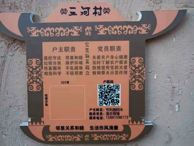 “我们把‘户联码’引入了三河村,以三河村家庭为单位,给每户农户建立一个‘户联码’,并张贴于农户家门口。”据浙江援川挂职干部、宁波余姚驻昭觉工作组成员、昭觉政府办副主任邬海滨介绍,“户联码”系统承载了农户家庭的多种信息,也内置了多种应用可与村委、其他村民及游客进行在线互动。