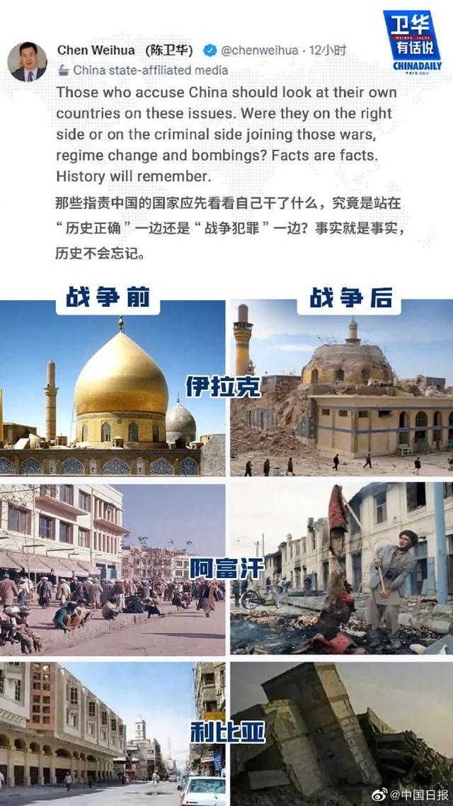 陈卫华在推文中指出了所谓“历史正确一边”的双标。他说,那些指责中国站在历史错误一边的人不知道他们自己在说什么。当中国反对并谴责伊拉克和阿富汗战争、利比亚政权更迭、无人机袭击主权国家、对古巴的禁运时,中国可真是站在了他们所谓的“错误”一边。那些指责中国的人应该在这些问题上审视自己的国家,他们是站在正确的一边,还是站在犯罪的一边,参与那些战争、政权更迭和轰炸?事实就是事实。历史会记住的。