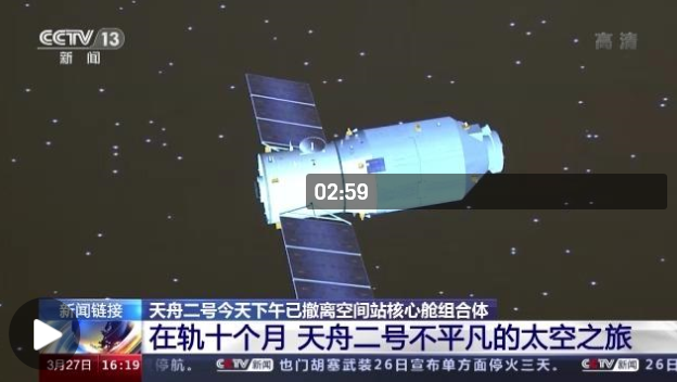北京航天飞行控制中心货运飞船任务总师 邹雪梅:实验完成了以后,天舟二号按计划要实施离轨,我们目前是两次的这样一个离轨的控制,最终在受控的状态下再入到南太平洋,在再入过程当中会彻底解体烧毁,不会对地面、海面的这些设施、船只带来影响。