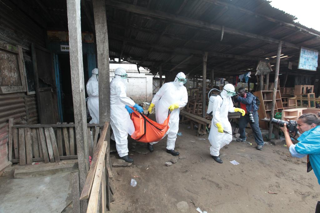 2014年10月14日,在利比里亚首都蒙罗维亚,工作人员将感染埃博拉病毒死亡者的尸体带离居民区。(新华社发)