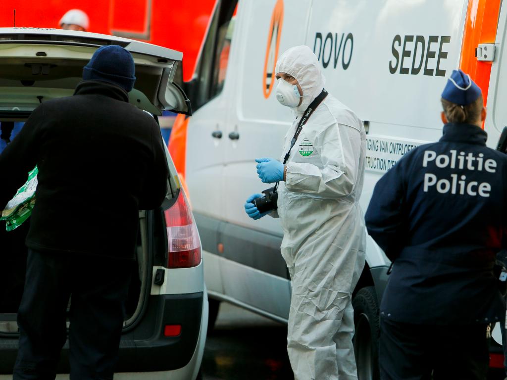 2015年11月26日,医护人员在比利时首都布鲁塞尔的大清真寺外工作。布鲁塞尔大清真寺内26日发现装有白色粉末的可疑包裹。警方疏散了大清真寺内的人员,工作人员携带检测炭疽杆菌的设备到场调查。(新华社记者周磊摄)