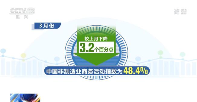 3月份,中国非制造业商务活动指数为48.4%,较上月下降3.2个百分点;新订单指数为45.7%,较上月下降1.9个百分点,显示非制造业供需增速较上月均明显放缓。
