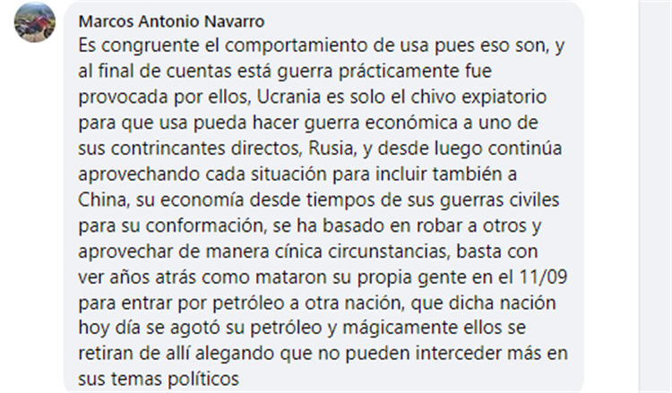 有西语网友表示,这场战争实际上是因美国而起,乌克兰只是替罪羊,美国却可以借此向俄罗斯挑起经济战:“美国当然还会继续利用各种事件,届时将把中国也卷进来。美国的经济从很久之前内战时期就是建立在窃取和利用别人的成果之上的,看看9.11事件,美国为了获取另一个国家的石油,杀了自己的人民,而另一个国家今时今日已经石油枯竭。荒谬的是此时美国说要撤军,借口说他们不再介入别国的政治了。”
