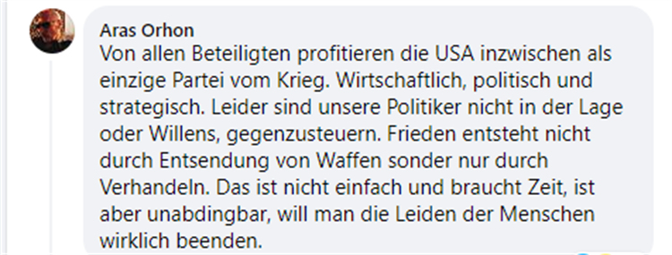 “他们希望战争继续下去以出售更多的武器。”德国网友也表示,美国是战争中唯一一个从各方获益的国家,包括经济、政治和战略层面。“可惜我们的政治家们既无能力也无意愿加以抵制。”海外网友道破美国在这场危机中的利益所在。