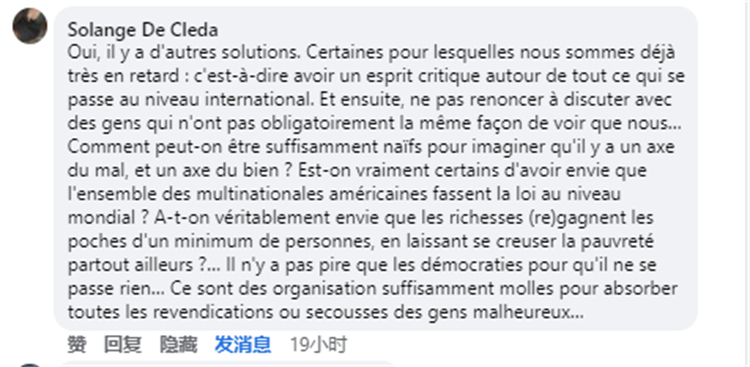 还有网友呼吁大家对国际层面发生的一切事情都要有批判性思维:“大家真的希望让美国的多边组织制定全球范围内的法律吗?大家真的希望让财富(重新)进入少数人的口袋,贫困在其他地方加剧吗?没有什么比未曾遭遇这一切的民主国家更糟糕了……这些组织像块‘海绵’吞没了所有不幸人民的声音和所遭遇的冲击……”