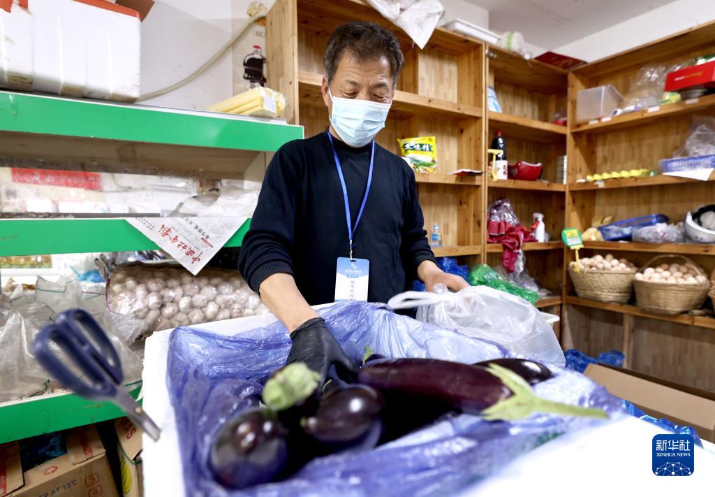 4月10日,上海超杰综合生鲜超市员工徐启银在恢复营业的店内为网上订单分装蔬菜。
