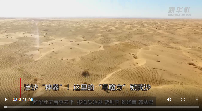 在我国第八大沙漠乌兰布和沙漠防沙治沙综合示范区,工人将麦草压入沙中制作草方格沙障。在连绵起伏的沙丘上,纵横交错的草方格犹如排列整齐的“魔方”,将一个个沙丘分割、锁住。